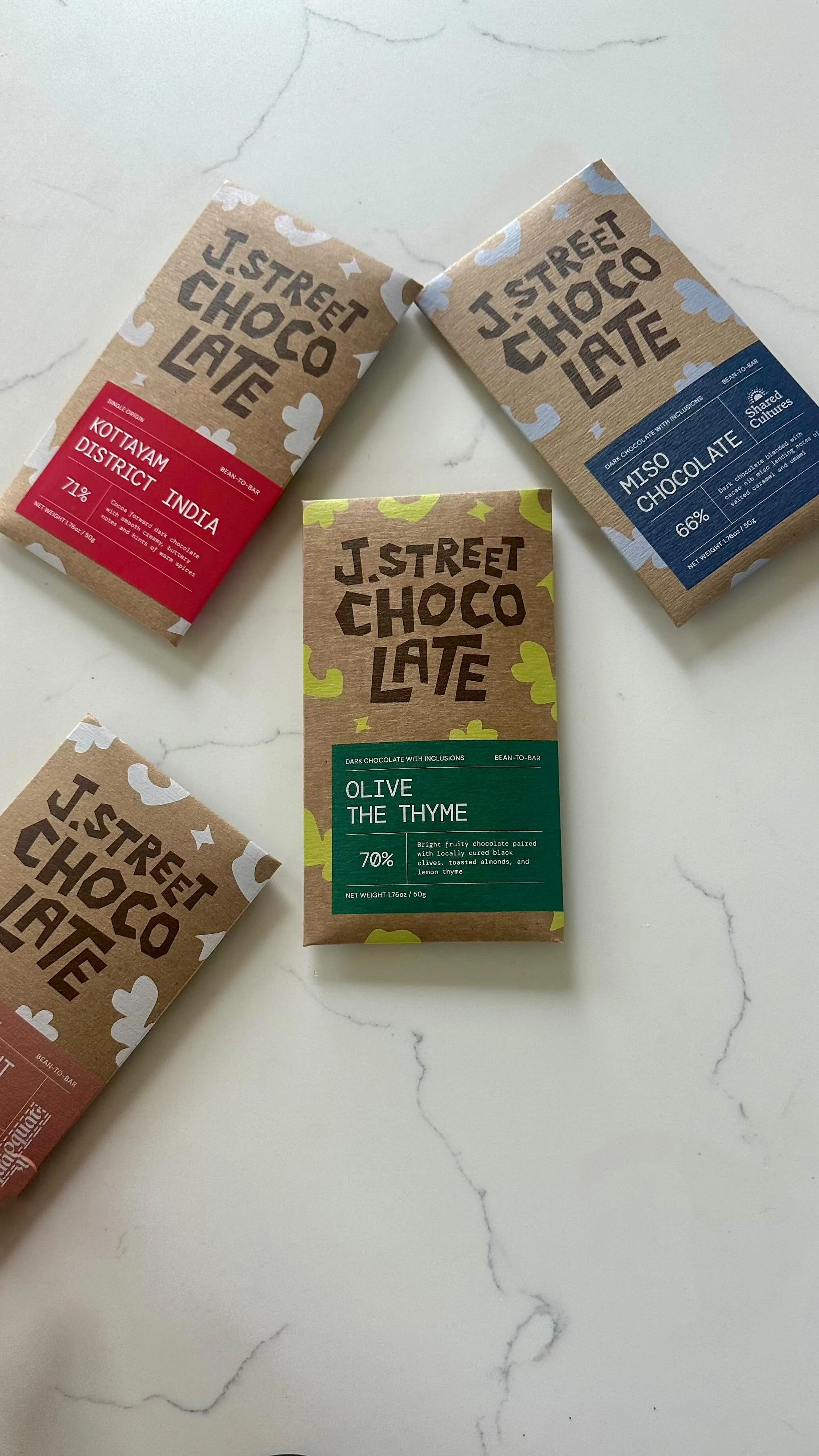 J. Street Chocolate reimagines the chocolate bar. Crafted with thoughtfully sourced cacao, each bar is made in small batches, featuring local ingredients like day-old sourdough bread or shoyu lees leftover from pressing shoyu. J. Street works to offer the perfect canvas to create inventive flavor combinations that are sure to amaze and delight while at the same time working to reduce waste and care for the people growing the cacao.
